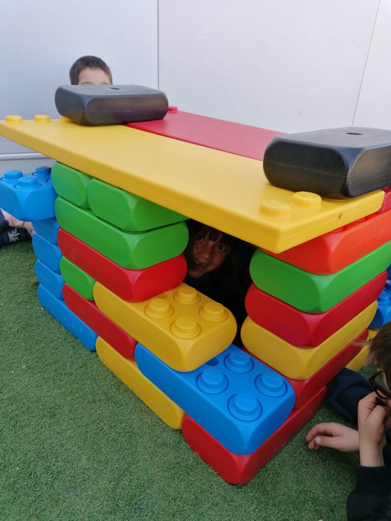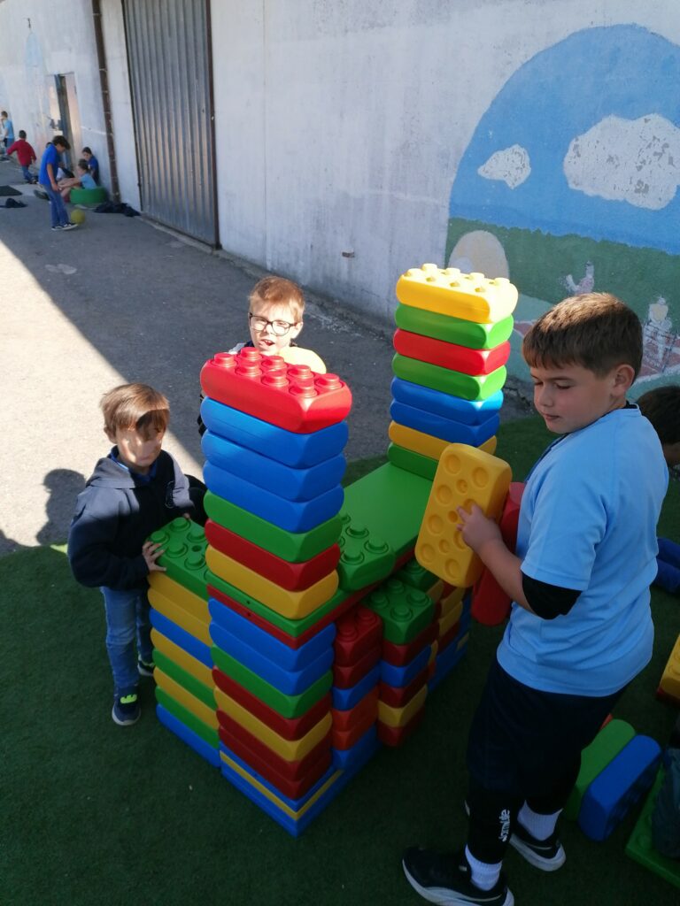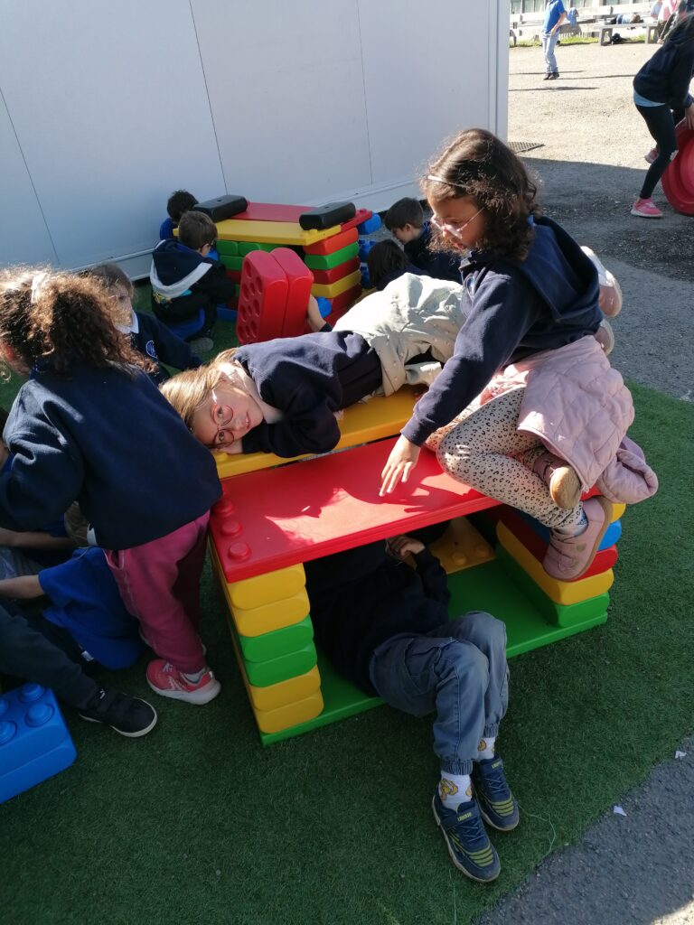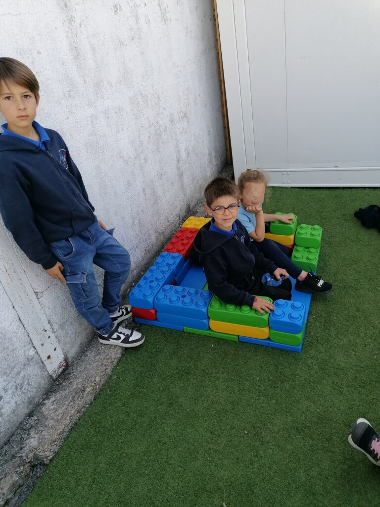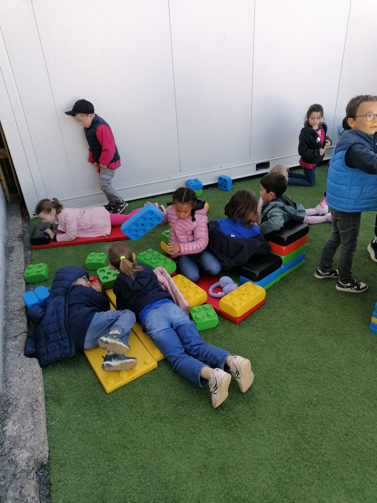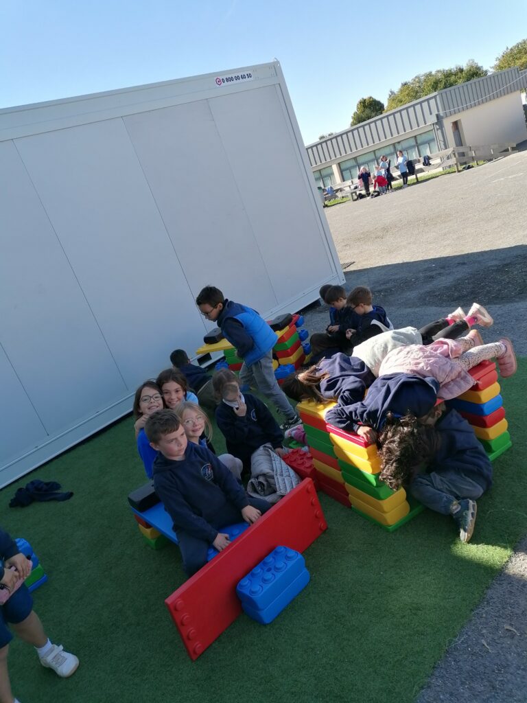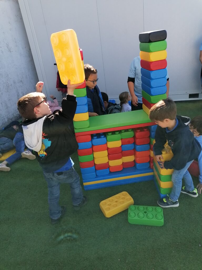 Pendant la pause méridienne, les enfants profitent de nouveaux jeux : des constructions en tout genre voient le jour grâce à la coopération et l’imagination de tous.